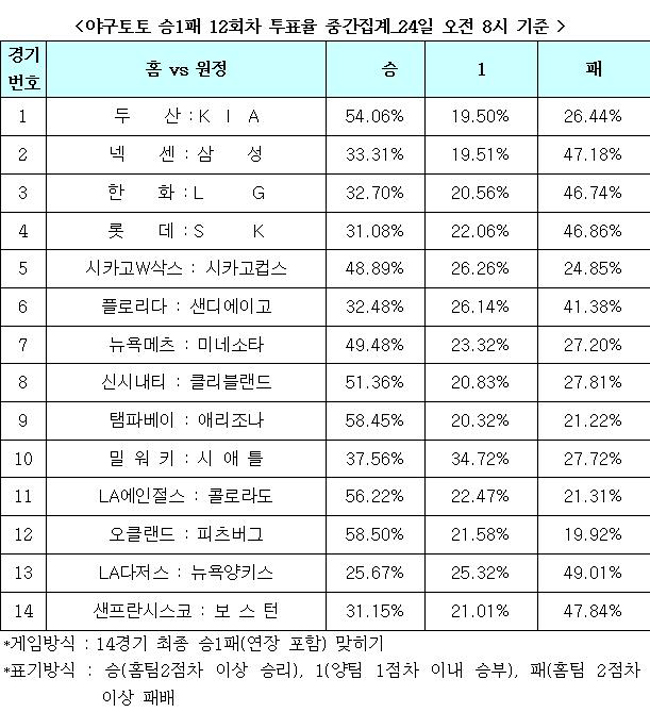 체육진흥투표권 수탁사업자인 오리온 계열의 스포츠토토(www.sportstoto.co.kr)는 오는 25일부터 이틀간 벌어지는 국내프로야구 4경기, 미국프로야구 MLB 10경기 등 총 14경기를 대상으로 한 야구토토 승1패 12회차 투표율 중간집계 결과 전체 참가자의 대다수인 54.06%가 2위 두산이 최근 부진에 빠져있는 KIA를 상대로 승리를 거둘 것으로 내다봤다.