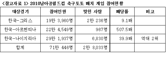 한국대표팀이 2010남아공월드컵에서 원정 월드컵 사상 처음으로 16강 진출을 이뤄내며 축구 국가대표팀에 대한 국민들의 응원의 목소리가 높아지고 있다. 이런 가운데 이번 남아공월드컵 경기를 대상으로 한 축구토토 게임 참여인원이 갈수록 크게 늘어나는 등 뜨거운 관심을 모으고 있다.