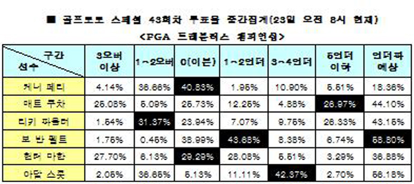 케니 페리(40.83%)와 헌터 마한(29.29%)는 나란히 이븐(0)파를 기록할 것으로 내다본 가운데, 리키 파울러가 1~2오버(31.37%)로 가장 부진한 성적을 낼 것으로 전망했다.
