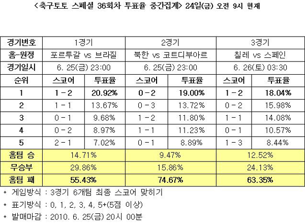 [축구토토] 체육진흥투표권 수탁사업자인 오리온그룹 계열 스포츠토토의 공식 온라인 발매 사이트인 베트맨(www.betman.co.kr)은 2010남아공 월드컵 조별예선 3경기를 대상으로 하는 축구토토 스페셜 36회차 투표율 중간집계 결과 포르투갈-브라질전에서 축구팬 55.43%가 브라질의 승리를 예상했다고 밝혔다.
