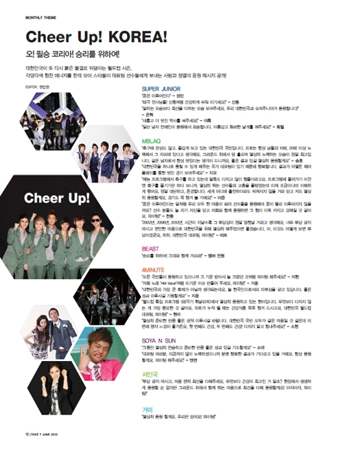SBS인기가요매거진 <TAKE7> 6호에 따르면 슈퍼주니어(SUPER JUNIOR) 은혁은 “잘하는 모습보다 최선을 다하는 모습 보여주세요. 대한민국과 슈퍼주니어가 응원합니다!”라며 선수들이 너무 부담을 갖지 않고 경기에 임할 수 있도록 힘을 실어주었고, 신동은 “태극 전사님들! 신동처럼 건강하게 싸워 이기세요!”, 희철은 “일단 남자 연예인이 응원해서 죄송합니다. 아름답고 화려한 날개를 펴주세요!”라며 위트있는 응원메시지를 남겼다.