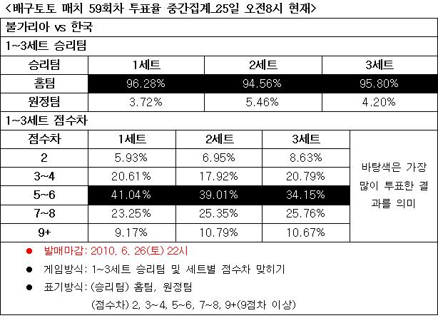 스포츠토토 공식 온라인 발매사이트인 베트맨(www.betman.co.kr)은 오는 27일 오전 1시(한국시간)에 치러지는 2010월드리그 국제남자배구대회 불가리아-한국전을 대상으로 한 배구토토 매치 59회차 게임 투표율 중간집계 결과 한국팀의 완패를 예상한 참가자가 대다수를 차지한 것으로 나타났다고 밝혔다.