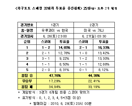 2010남아공월드컵 16강전 2경기 대상 축구토토 스페셜 37회차 투표율 중간집계