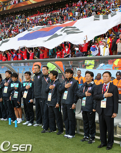 경기전 한국 허정무 감독을 비롯한 코칭스태프가 애국가 연주를 들으며 가슴에 손을 올리고 비장한 표정을 짓고 있다. /spjj@osen.co.kr