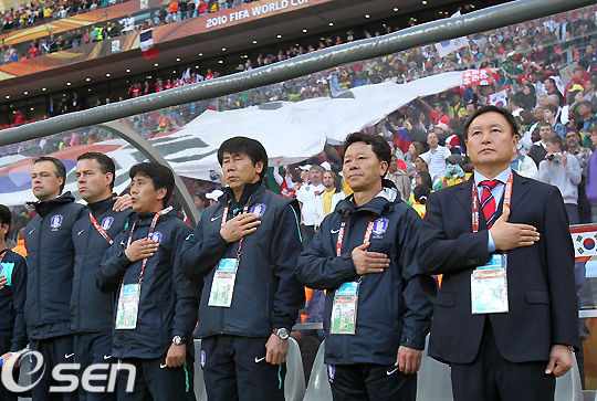 경기전 한국 허정무 감독을 비롯한 코칭스태프가 애국가 연주를 들으며 가슴에 손을 올리고 있다. /spjj@osen.co.kr