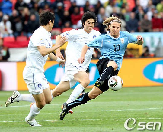 전반 한국 이정수 기성용이 우루과이 포를란을 수비하고 있다. /spjj@osen.co.kr