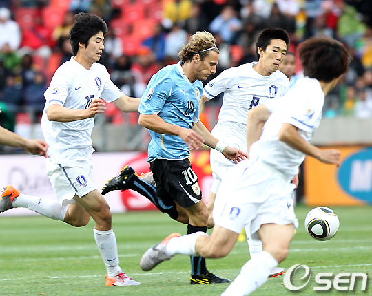 전반 한국 기성용 김정우가 우루과이 포를란을 수비하고 있다. /spjj@osen.co.kr
