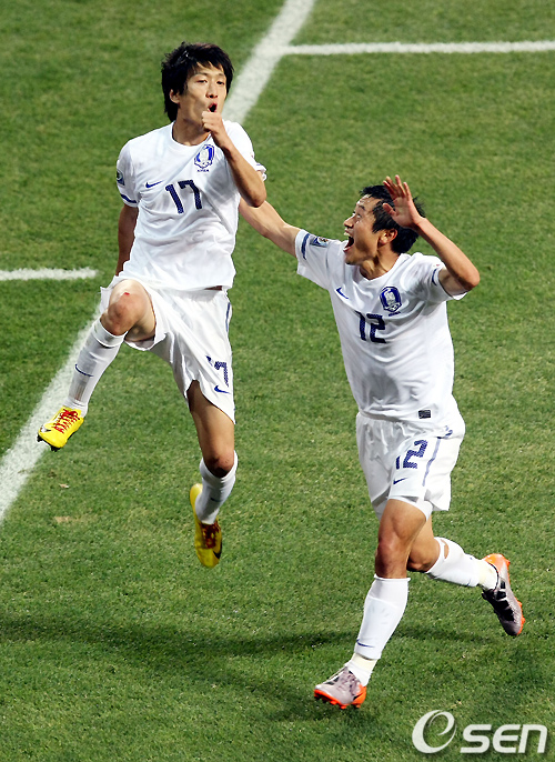 후반 한국 이청용이 문전에서 헤딩으로 동점골을 성공시키며 기뻐하고 있다. /spjj@osen.co.kr