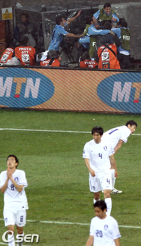 후반 우루과이 수아레스가 골을 넣고 환호하는 반면 한국 선수들이 아쉬워하고 있다. /spjj@osen.co.kr