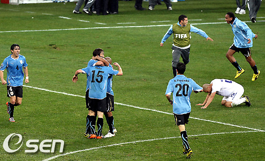 경기 종료를 알리는 휘슬이 불리자 우루과이 선수들이 환호하는 반면 차두리가 주저앉고 있다. /spjj@osen.co.kr
