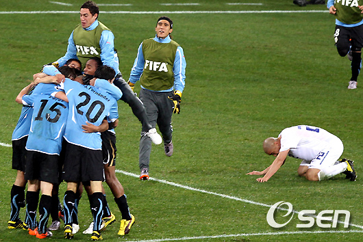 경기 종료를 알리는 휘슬이 불리자 우루과이 선수들이 환호하는 반면 차두리가 주저앉아 아쉬워하고 있다. /spjj@osen.co.kr