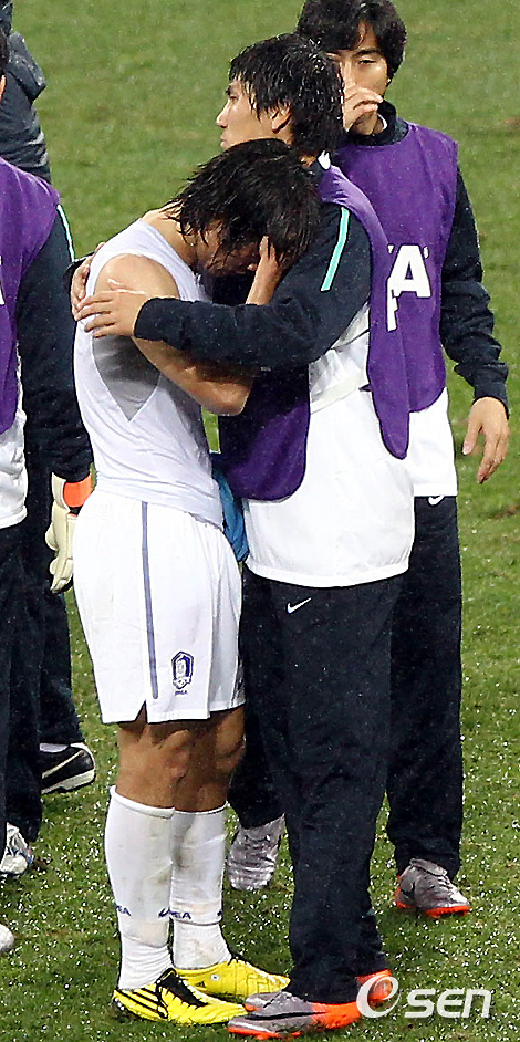 경기 종료 후 박주영이 눈물을 보이자 김동진이 격려하고 있다. /spjj@osen.co.kr