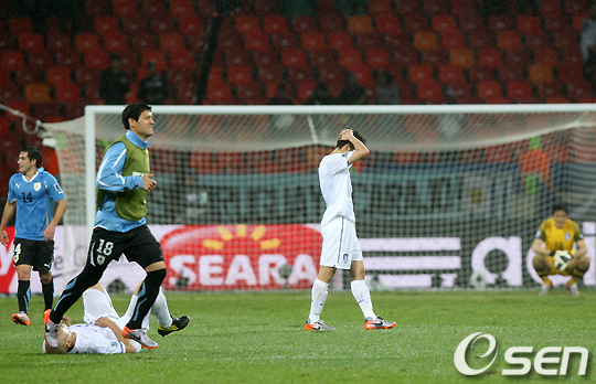 [OSEN/머니투데이=포트 엘리자베스(남아공), 손용호 기자] 허정무 감독이 이끄는 한국 축구 대표팀(FIFA랭킹47위)이 27일(이하 한국시간) 새벽 포트엘리자베스 넬슨만델라베이 스타디움에서 끝난 2010 남아공월드컵 16강 우루과이(16위)와 경기에서 1-2로 패했다.