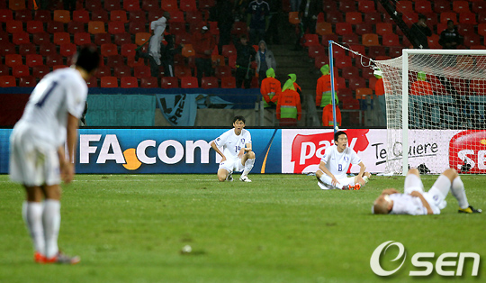 [OSEN/머니투데이=포트 엘리자베스(남아공), 손용호 기자] 허정무 감독이 이끄는 한국 축구 대표팀(FIFA랭킹47위)이 27일(이하 한국시간) 새벽 포트엘리자베스 넬슨만델라베이 스타디움에서 끝난 2010 남아공월드컵 16강 우루과이(16위)와 경기에서 1-2로 패했다.