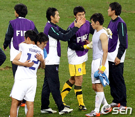 [OSEN/머니투데이=포트 엘리자베스(남아공), 우충원 기자] 한국 축구의 패배를 아쉬워 하는 듯 포트 엘리자베스의 하늘도 눈물을 흘렸다. 선수들은 서로를 안아주며 노력에 대해 칭찬했다.