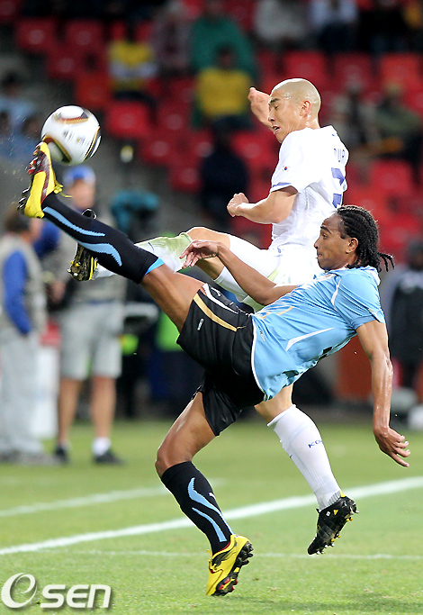 후반 우루과이 선수가 차두리에 앞서 볼을 걷어내고 있다. /spjj@osen.co.kr