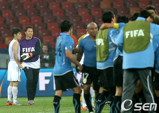 [OSEN/머니투데이=포트 엘리자베스(남아공), 손용호 기자] 허정무 감독이 이끄는 한국 축구 대표팀(FIFA랭킹47위)이 27일(이하 한국시간) 새벽 포트엘리자베스 넬슨만델라베이 스타디움에서 끝난 2010 남아공월드컵 16강 우루과이(16위)와 경기에서 1-2로 패했다.