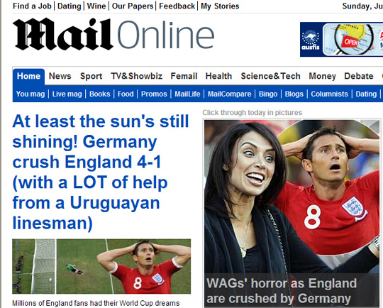 잉글랜드 언론이 이런 상황에 불만을 드러내는 것은 당연한 일. 영국의 '데일리 메일'은 "우루과이 부심이 독일을 도왔다"고 지적했다. 람파드의 때린 볼이 골라인 안쪽으로 떨어졌다는 사진까지 첨부한 이 보도에서 오심에 대한 비판은 확연했다.