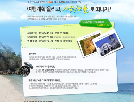 스토리 에디터 당선자는 여행상품권으로 여행을 마친 후 필리핀에서의 경험과 참신한 여행정보 6건을 자유롭게 작성해 관련 사진과 함께 게시판에 올리면 된다. 등록된 여행정보는 온필 홈페이지 및 블로그에 소개될 예정이다.