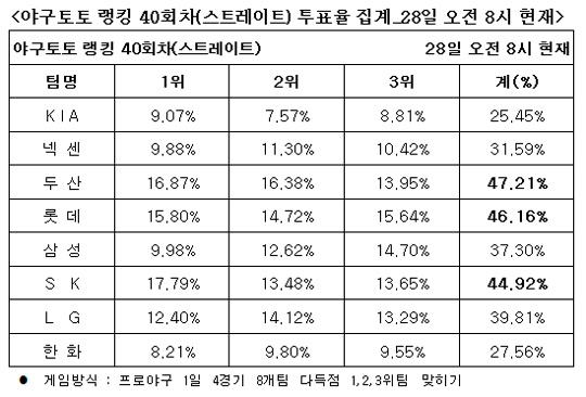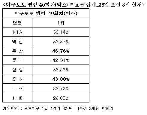 국내 야구팬들은 29일 열리는 야구토토 랭킹 게임 40회차 대상 8개팀 가운데 롯데, 두산, SK의 다득점을 예상하고 있는 것으로 나타났다.