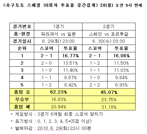 2010남아공월드컵 16강전 대상 축구토토 스페셜 38회차 투표율 중간집계