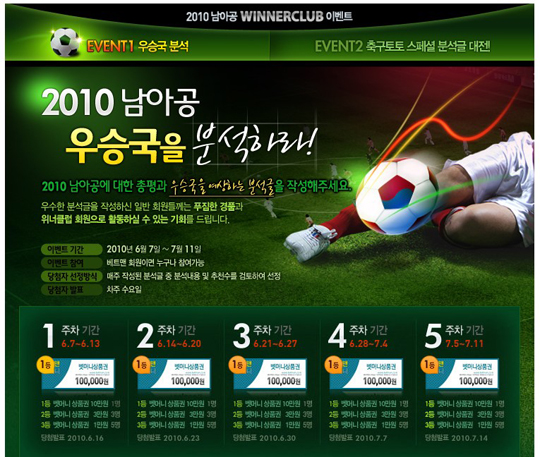 이번 이벤트는 남아공월드컵에 대항 총평과 우승국을 예상하는 분석글을 작성하는 방식으로 진행되며 당첨자 선정 방식은 매주 작성된 분석글 중 분석내용 및 추천 수를 검토하여 선정되며 베트맨 회원이라면 누구나 참여 가능하다.