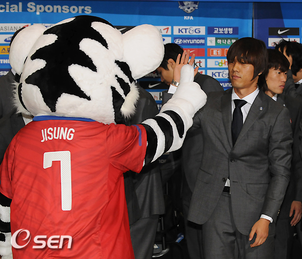 박주영이 호랑이 마스코트와 하이파이브를 하고 있다./ ajyoung@osen.co.kr
