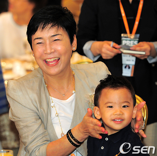 해단식에 앞서 허정무 감독 부인 최미나씨가 손자와 미소짓고 있다. /jpnews@osen.co.kr