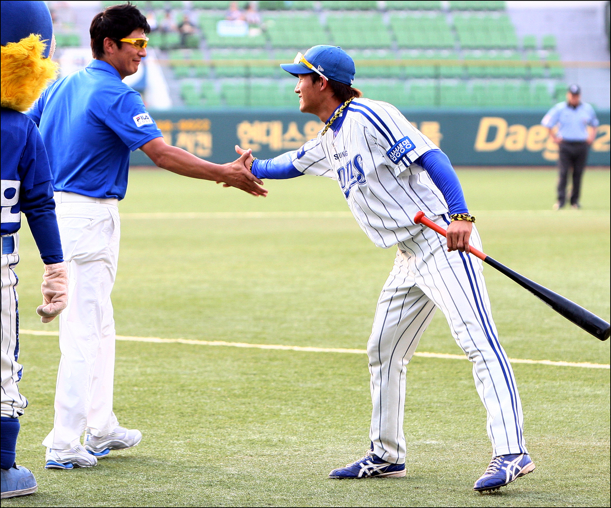 '욘사마' 배용준의 골프 스승으로 잘 알려진 이병용 프로 골퍼(매직스윙 골프아카데미 대표이사)가 29일 대구 롯데전에 앞서 시구에 나섰다.