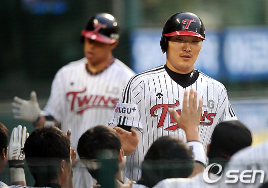 3회말 1사 1,2루 LG 정성훈의 우익수 중간에 떨어지는 역전 2타점 적시타때 1루 주자 이병규와 2루 주자 이진영이 홈을 밟은 뒤 덕아웃에서 환영을 받고 있다. /soul1014@osen.co.kr