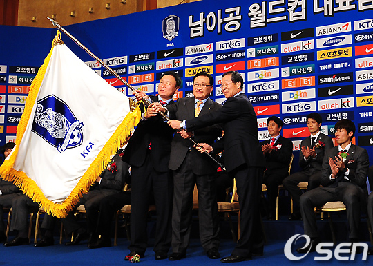 허정무 감독과 노흥섭 단장이 조중연 회장에게 단기를 반납하며 휘날리고 있다. /jpnews@osen.co.kr