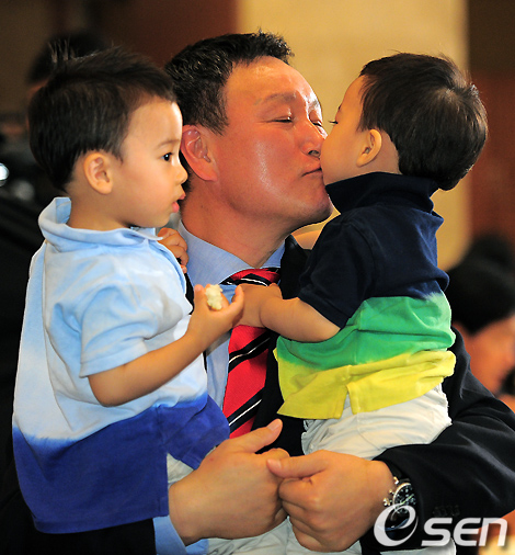 허정무 감독이 손자를 안고 뽀뽀를 하며 즐거워하고 있다. /jpnews@osen.co.kr