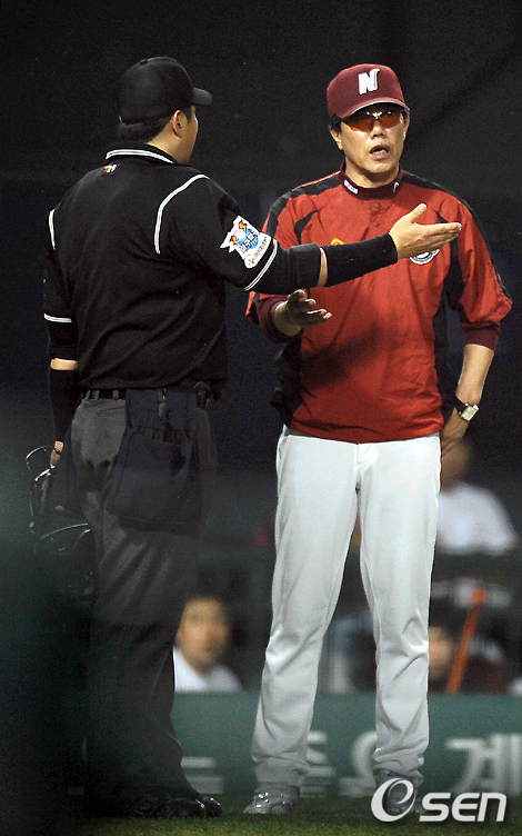 6회말 LG 선두타자 오지환이 몸에 맞는 공으로 1루로 진루하자 넥센 김시진 감독이 그라운드에 나와 김정국 구심에게 항의하고 있다. /soul1014@osen.co.kr