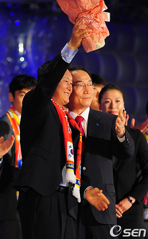 무대 위에서 허정무 감독이 김인규 KBS 사장에게 꽃다발을 받은 후 환하게 미소짓고 있다. /rumi@osen.co.kr