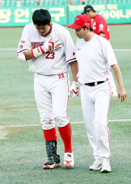 최희섭은 29일 광주 SK전 1회말 공격에서 1루를 밟는 과정에서 상대 수비수와 충돌해 쓰러졌다. 1사2,3루에서 1루 땅볼을 때렸고 전력질주하는 과정에서 베이스를 밟고 앞으로 지나가던 SK 1루수 이호준과 부딪혀 그대로 나동그라졌다.