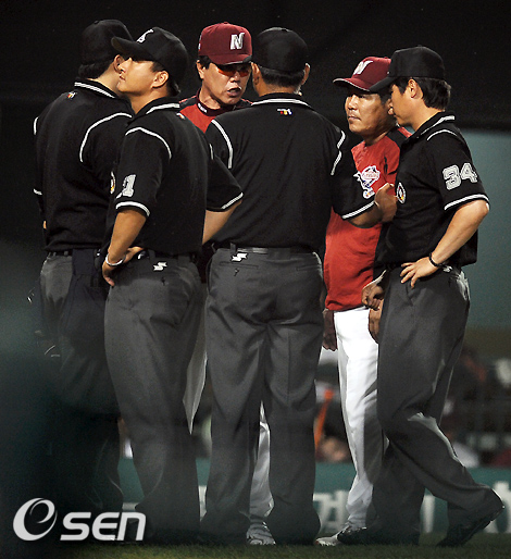 6회말 LG 선두타자 오지환이 몸에 맞는 공으로 1루로 진루하자 넥센 김시진 감독이 그라운드에 나와 김정국 구심에게 항의하고 있다. /soul1014@osen.co.kr