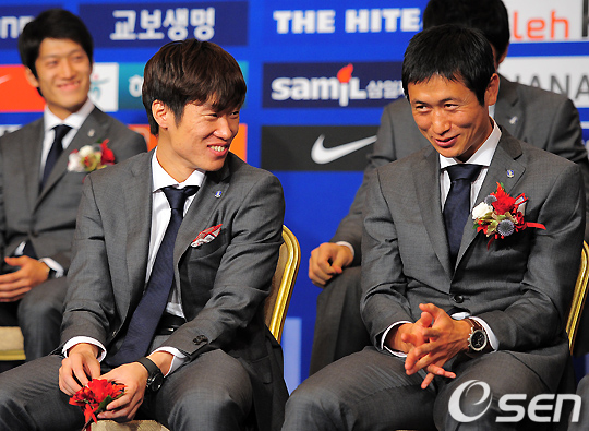 박지성 이영표가 질문을 들으며 미소짓고 있다. /jpnews@osen.co.kr