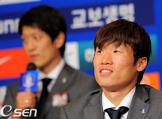 박지성이 이청용의 답변을 들으며 미소짓고 있다. /jpnews@osen.co.kr