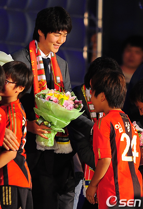 무대 위에서 기성용이 꽃다발을 받으며 환하게 미소짓고 있다. /rumi@osen.co.kr