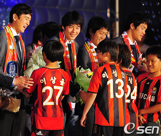 무대 위에서 이정수 기성용 이청용 정성룡이 꽃다발을 받으며 환하게 미소짓고 있다. /rumi@osen.co.kr