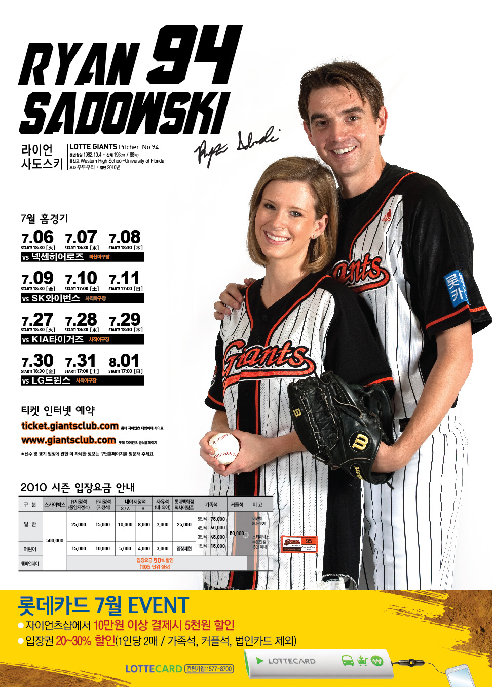7월 경기일정 포스터는 라이언 사도스키와 아내 린지 사도스키가 함께 촬영했으며 선수 프로필과 함께 7월 홈경기 일정, 입장요금 안내 등이 실려 있다.