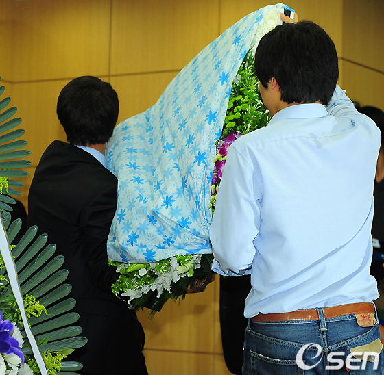 30일 낮 12시 현재 고인의 영정사진은 흰 바탕에 푸른 문양이 들어간 보자기에 싸인 채 유족들에 의해 빈소로 옮겨졌다. 어떤 사진이 쓰였는지는 아직까지 확인되지 않고 있다.