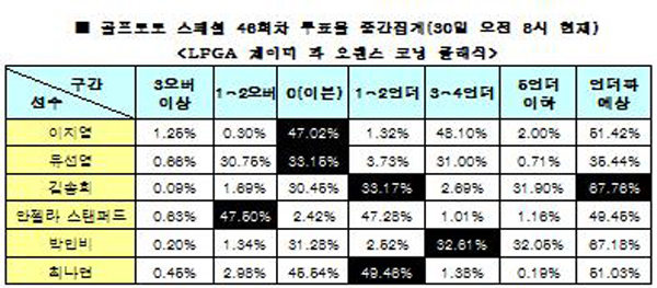박인비가 67.18%로 2순위를 차지했고, 이지영과 최나연이 각각 51.42%와 51.03%로 절반 이상의 언더파 투표율을 획득했다. 반면, 안젤라 스텐퍼드(49.45%)와 유선영(35.44%)은 50%이하의 언더파 투표율을 보여 상대적으로 부진한 1라운드를 치를 것으로 예상했다.