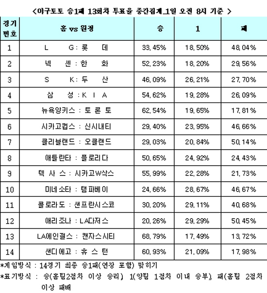 야구토토 승1패 13회차 투표율 중간 집계 결과… SK, 두산에 승리 전망