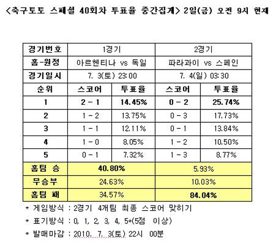 [축구토토] 체육진흥투표권 수탁사업자인 오리온그룹계열 스포츠토토의 공식 온라인 발매 사이트인 베트맨(www.betman.co.kr)은 2010 남아공 월드컵 8강전 2경기를 대상으로 하는 축구토토 스페셜(더블) 40회차 투표율 중간집계 결과 아르헨티나-독일전에서 축구팬 40.80%가 아르헨티나의 우세를 예상했다고 밝혔다.