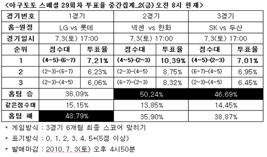 2010시즌 프로야구 주말 3경기 대상 야구토토 스페셜 29회차 투표율 중간집계