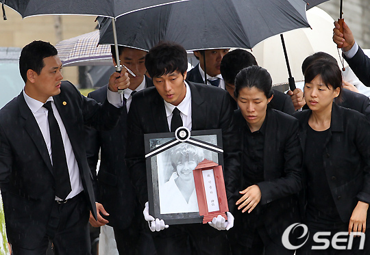 빈소가 마련됐던 서울 반포동 강남성모병원에서는 이날 오전 6시가 조금 넘은 시각, 절친 소지섭을 비롯한 유족들이 고인의 영정을 들고 현관으로 나섰다. 하늘에서 부슬부슬 비가 내리는 가운데 수백여 명의 팬들이 몰려 고인의 가는 길을 배웅했다.