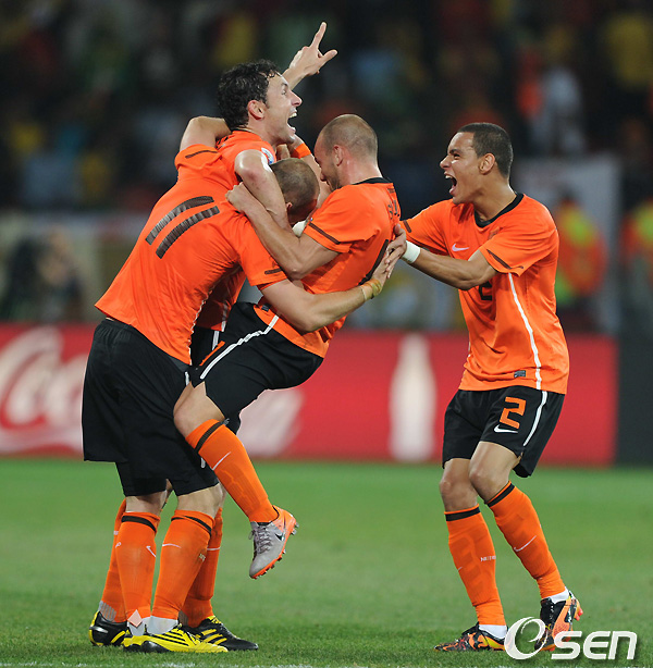 브라질을 물리치는데 일등공신인 스네이더가 동료들과 기쁨을 나누고 있다. /spjj@osen.co.kr