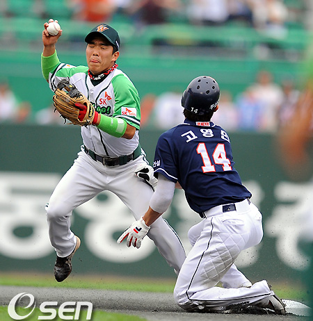 1회초 무사 1루 두산 김현수의 내야땅볼 때 SK 정근우가 1루 주자 고영민을 포스아웃 시켰으나 1루 송구에는 실패하고 있다. /soul1014@osen.co.kr