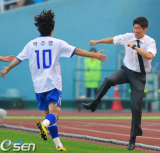 팬들의 폭소를 모은 전반 10분 박주영의 득점 세리머니가 대표적이었다. 득점에 성공한 박주영이 자신에게 달려오자 살짝 걷어차는 시늉을 하면서 친구같은 그리고 동료같은 감독 스타일을 보인 것.